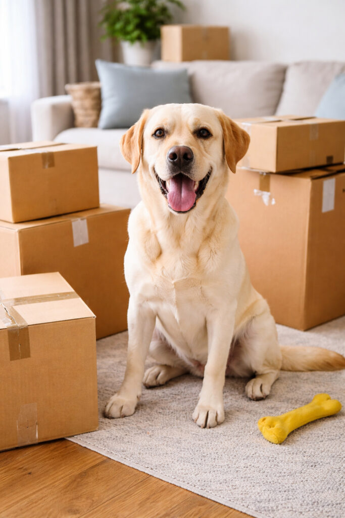 Moving day can be busy, especially with removals teams going in and out of the property. Try to keep your tone calm and reassuring. If possible, have a family member or friend look after your dog for the day — this can reduce anxiety and prevent them from getting underfoot.